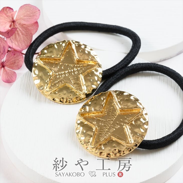 ヘアゴム パーツ 変退色防止加工済み セッティング台 ラウンド スター ゴールド 台座全長33.5mm 2個 2ヶ ミール皿 リングゴム 約3.4cm アクセサリーパーツ 問屋 ヘアアクセ 髪飾 レジン用品 コンチョ コンチョポニー 星 丸 プレート 鎚目模様 さや工房 倍 手作り